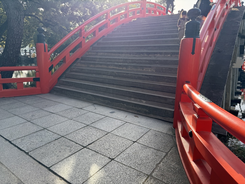 住吉大社の反橋(太鼓橋)はかなり厳しい傾斜になっています。その最大傾斜は48度もあるということです。(住吉大社「反橋」