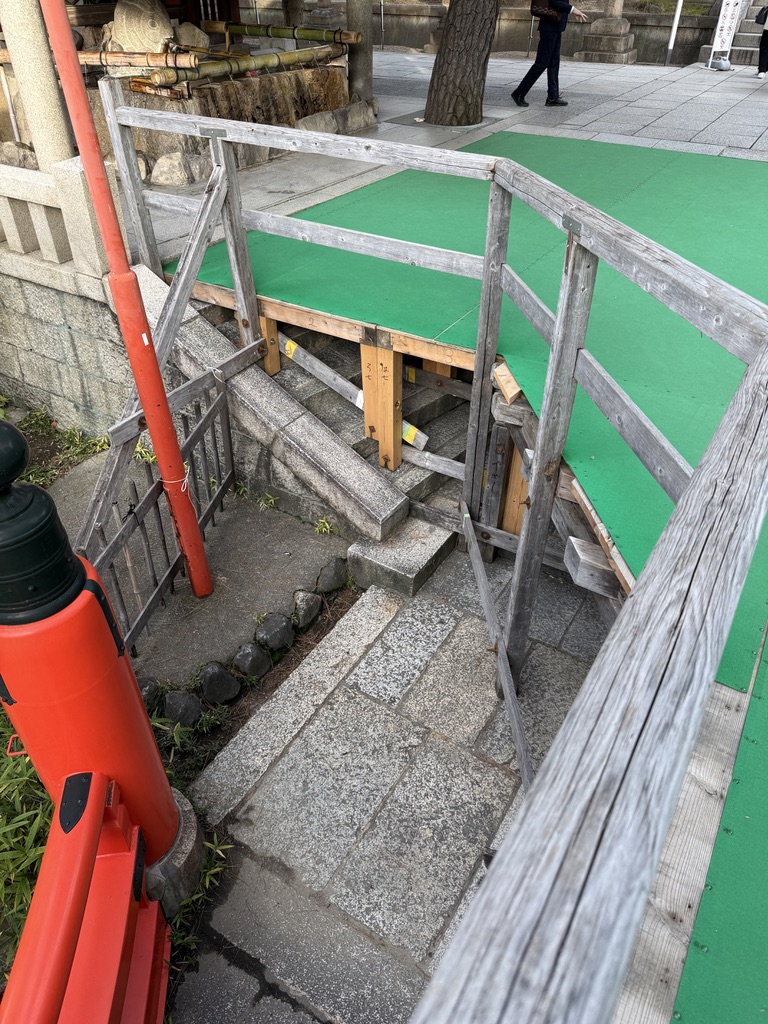 なんと年末年始の少しの期間、反橋の最後の数段と手水舎をつなぐ足場が作られているんです。これを初めて見た時は「ああ、なんか工事してるんやな」と思ってましたが、よく考えれば危険回避のために作られたスロープだったのですね。