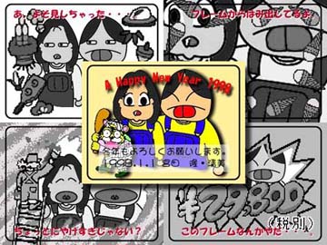 今年のテーマは、プリクラ。今更?と思うでしょうが、パソコンブームでパソコン買ったが何に使うか判らない年代にとって自宅でプリクラ作れる「デジカメ」「カラープリンタ」は、救世主になっているのでは?というコンセプトです。デザイン的には、撮影に失敗したプリクラを(よそ見、枠外等)モノトーンで表し、成功したイメージを浮きだたせています。