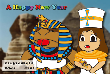 蛇のイラストってなかなか難しいですよね。リアルに書くと嫌悪されるし、可愛すぎると怖さが無くなってしまいます。ということで、ファラオになってみました。実際のツタンカーメンの黄金の仮面だと「コブラ」と「鷹」が対で飾られていますが、「巳年」にちなんで「コブラ」だけにしときました。ちなみに「Key」が持っているのは「蛇」をあしらった「杖」です。